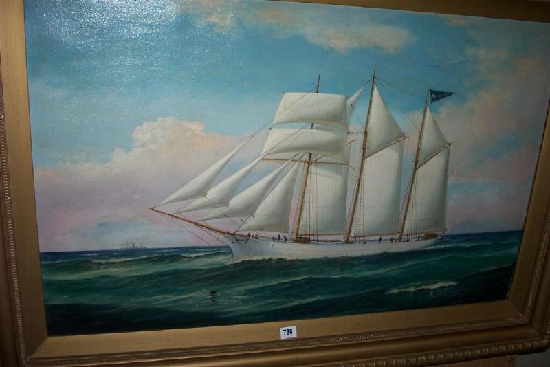 a 3-masted sailing ship The Annie Reece at high seas with steam ship to the horizon
