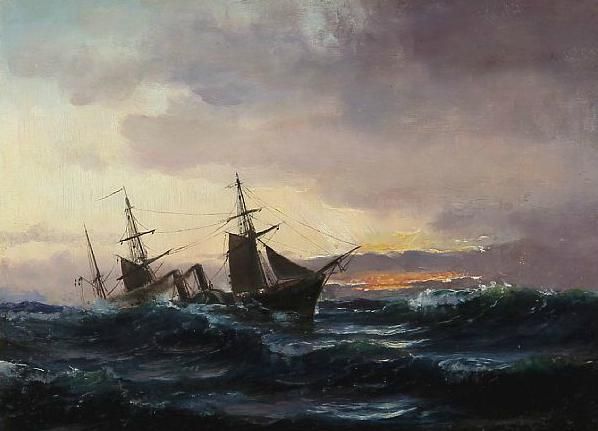 Seascape with a steamship in high waves.