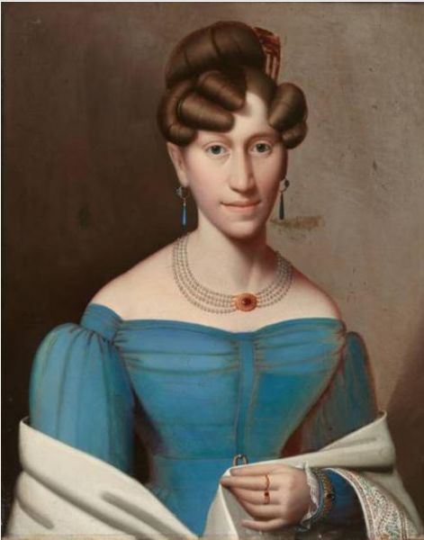 | Braunschweig. Portrait einer jungen Frau mit Türkispendeloques und vierreihiger Perlenkette im blauen Biedermeierkleid mit besti | |