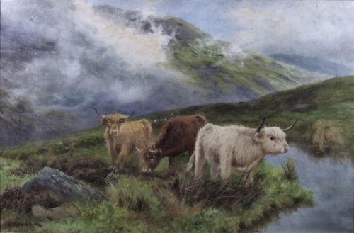 Misty Scottish moorland scene with three Highland cattle to foreground