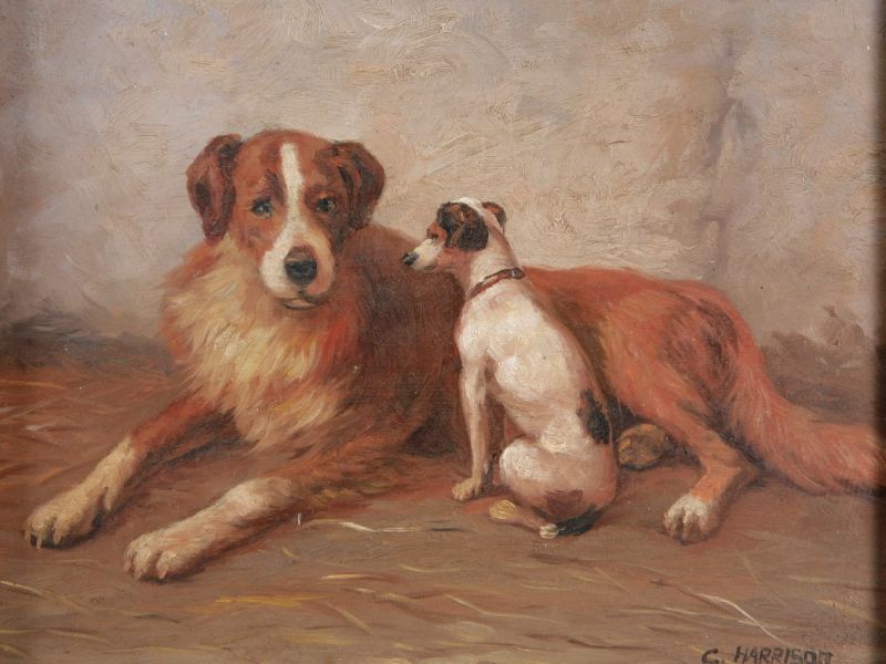 | GOOD FRIENDS, a brown and white Border Collie and a Jack Russell, side by side, | |