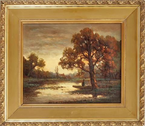 Herbstlandschaft mit Angler auf kleinem Weiher