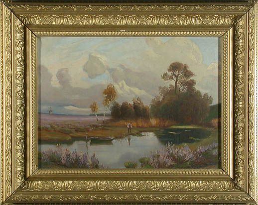 | Blick auf einen Weiher am Rande eines Wäldchens, am Ufer ein Angler neben seinem Boot | |