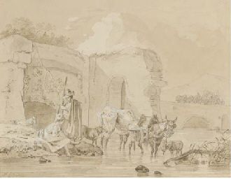 Shepherds watering their animals by a ruined bridge, a horse and cart seen beyond