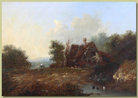 | Figure on a country path with a village beyond and C. Morris Senr. Duck on a pond by a thatched cottage | |