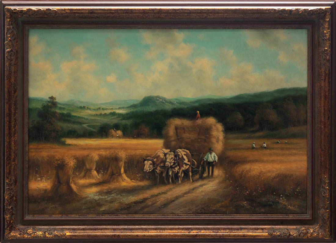 | Cereal field with harvesting farmers in the foothills of the Alps, in the foreground a heavily loaded ox-team. | |