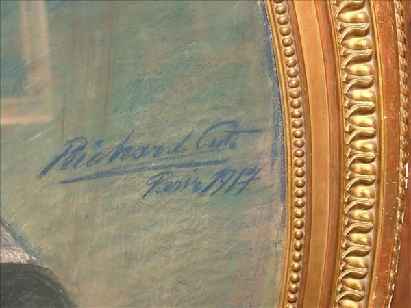| Portrait of a lady, Half length standing, wearing a dark purple dress and pearls | |