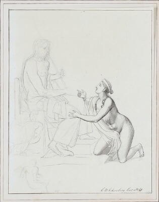 “Venus bønfalder Jupiter”. Venus pleading with Jupiter. Verso A peasant. 1806. Unsigned. Inscribed C. W. Eckersberg Cat. No. 41. Drawing ink, wash and pencil on paper. Sheet size 243×205 mm. | |