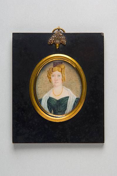 | A Lady, wearing green dress, a white scarf around her shoulders, gold necklace, her fair hair upswept with tortoiseshell comb an | |