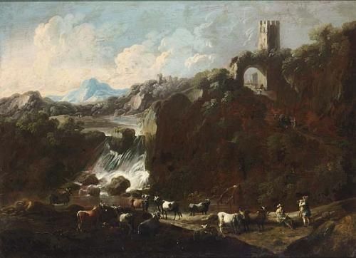 | AN ITALIANATE ROCKY RIVER LANDSCAPE WITH A WATERFALL AND COWHERDS WITH THEIR HERD | |