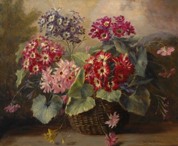 Stilleben med blommor i korg