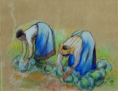 Deux paysannes ramassant des choux