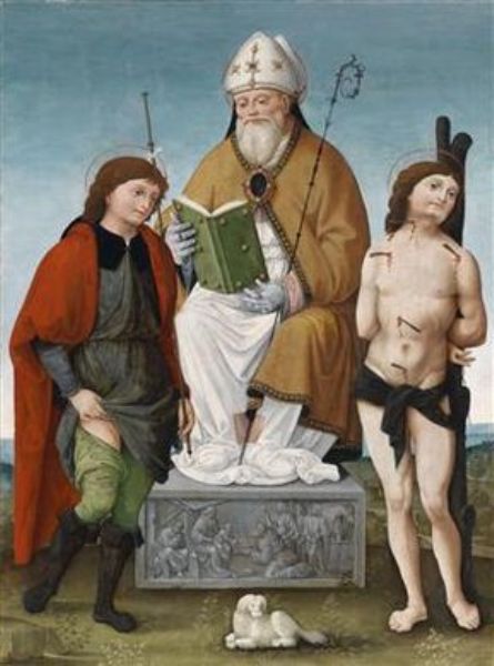 Saint Augustus enthroned on a relief and flanked by Saints Roch and Sebastian