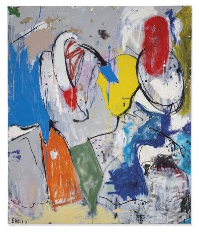| Oil spray paint, enamel, collaged R + F wrappers, preservative packet on canvas | |