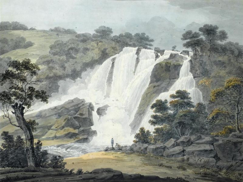 INDIAN LANDSCAPE WITH FIGURES AT A WATERFALL