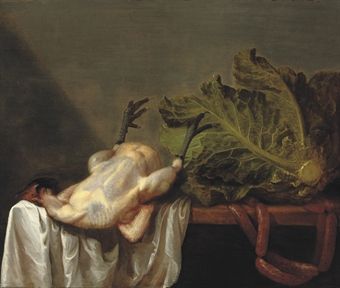 | A plucked chicken, cabbage and sausages on a partially draped table | |