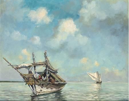 | Uferstück in Niederländisch Ostindien mit Segelbooten und vorbeiziehenden Dampfern. | |