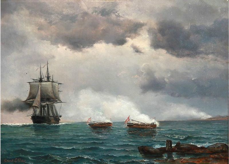 | Battle scene from the Napoleon Wars, Danish privateers are attacking a foreigh ship of the line. | |