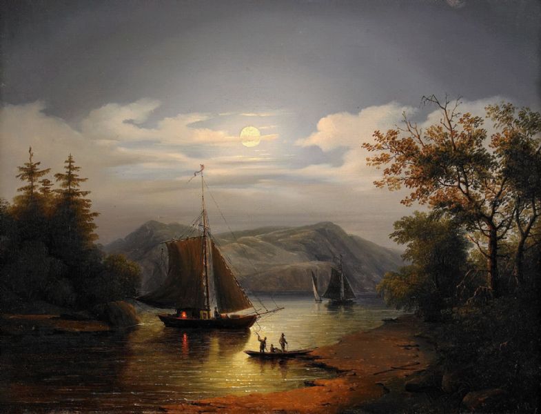 Kustlandskap med skutor i månsken