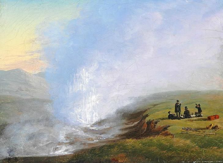 | Wanderers picnicking near the hot springs near Uxahver, Iceland | |