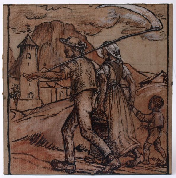 Bauernfamilie mit Kind, auf eine Gebäudegruppe zustrebend