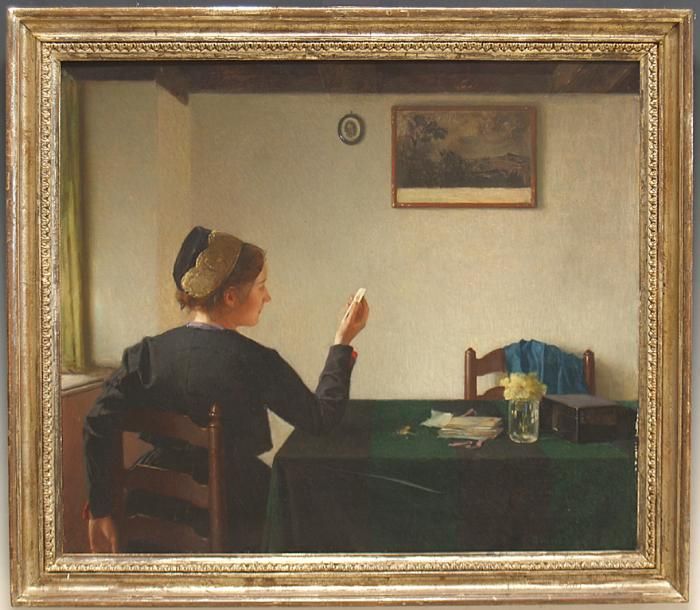 | Stubeninterieur mit an einem Tisch sitzenden Mädchen in Tracht | |
