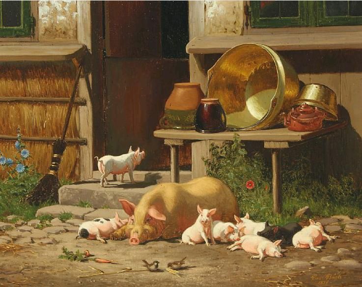 Summer day with a sow and her piglets