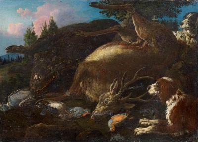Hunt Scene with Dead Red Deer, Wild Boar and Songbirds