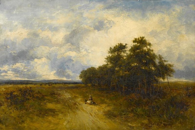 AN EXTENSIVE LANDSCAPE WITH A FIGURE AND DOG RESTING BY TREES