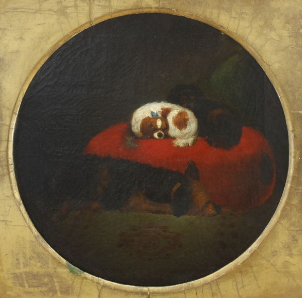 Drei ruhende Hunde, mit rotem Polster