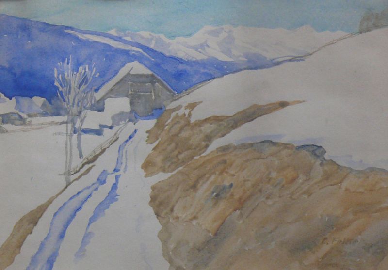 ''Winterliche Berglandschaft'' mit Weg zu eifnem Gehöft