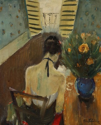 | Interior with a woman sitting with her back turned in front of a balcony | |
