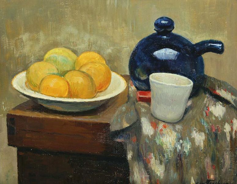 Still-life with a tea pot, mug and fruit on a table