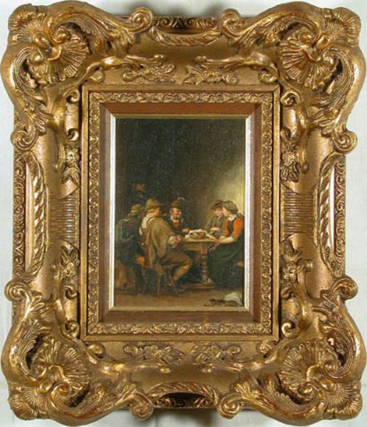 | Interieurszene mit zwei Frauen und drei Pfeife rauchenden Herren in Tracht an einem Tisch | |
