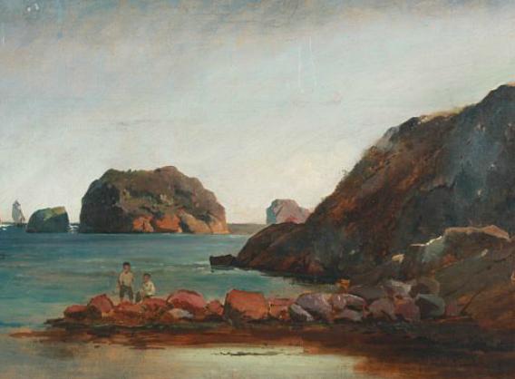 | Rocky coast with two boys fishing | |