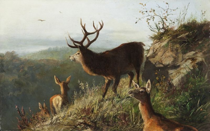 | Kapitaler Hirsch und drei Ricken auf herbstlich bewachsener Anhöhe über weiter Landschaft | |