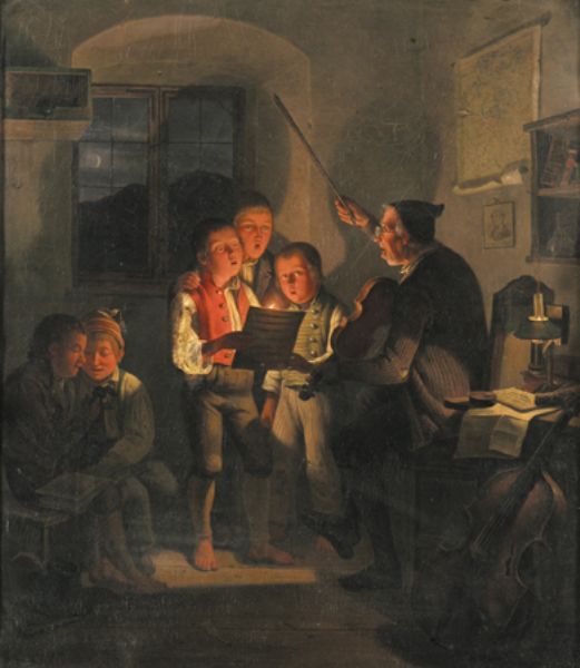 | Abendliche Musikstunde.- Interieur mit singenden Knaben und ihrem Musiklehrer | |