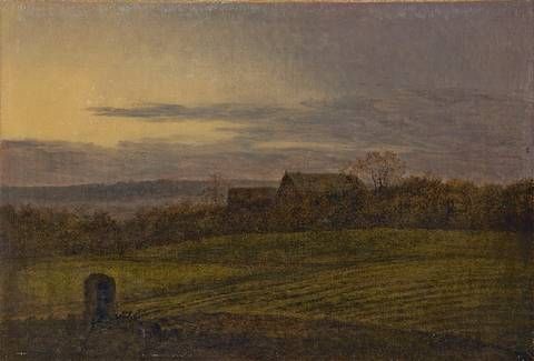 BLICK ÜBER ABENDLICHE FELDER AUF EIN GEHÖFT