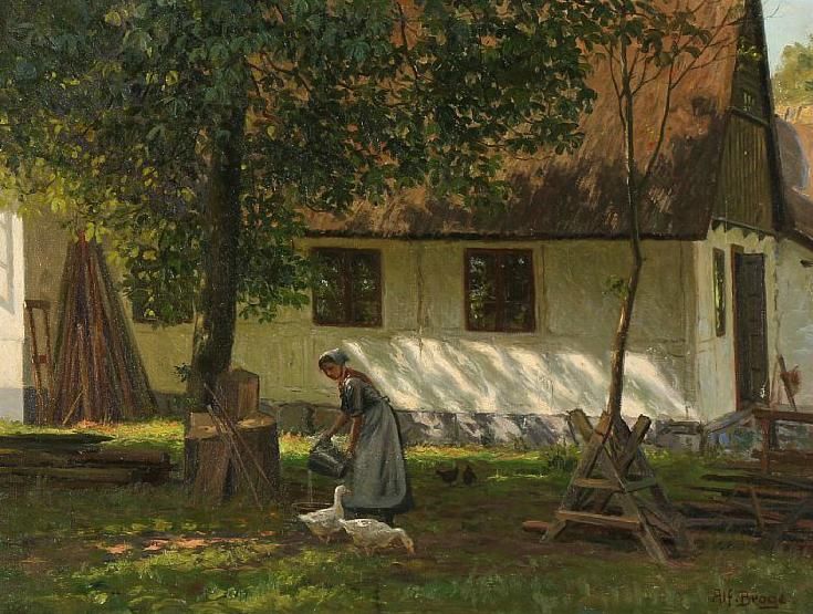 | Garden at a white farm, where the girl is giving the geese water. | |