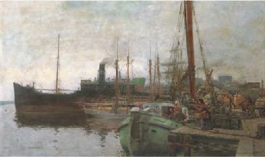 Ships moored along a busy quay