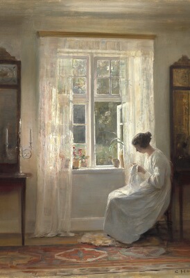 | Interior with the artist's wife sitting with her needlework next to an open window | |