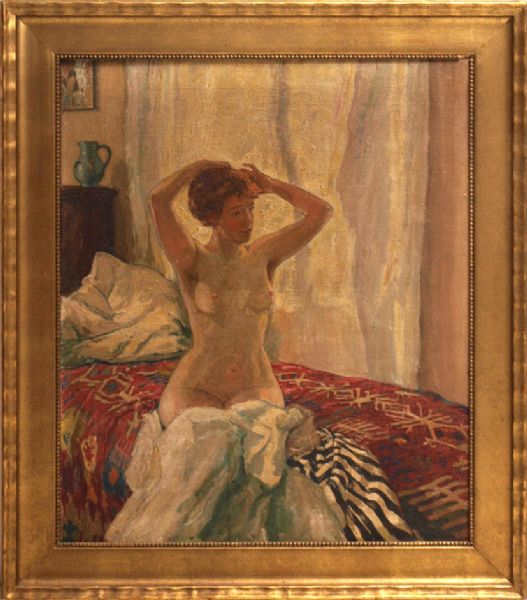 | Unbekleidete junge Frau beim Hochstecken ihrer Haare, auf einem mit einem Kelim bedeckten Sofa sitzend. | |