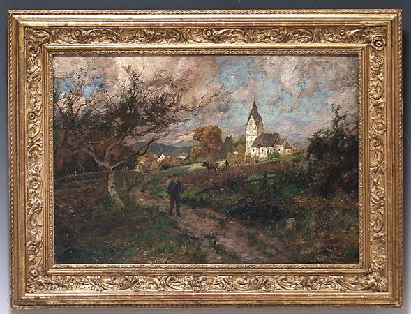 | Rheinländische Spätsommerlandschaft: Häuseransiedlung, im Hintergrund Bauernpaar beim Bestellen des Feldes vor der Kirche, im Vo | |