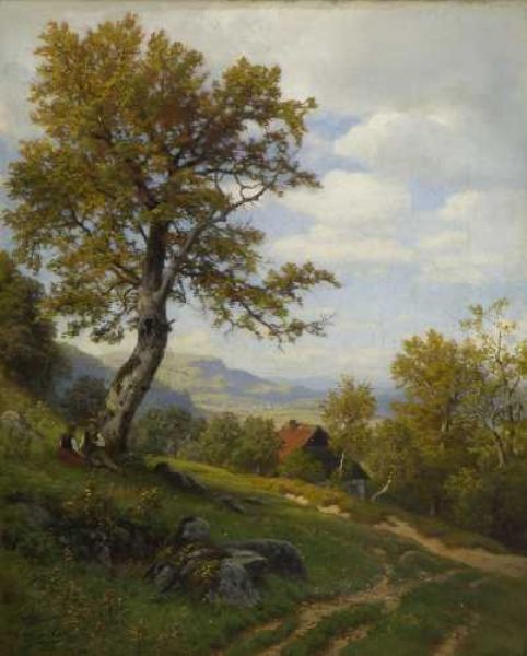 Spätsommerliche Landschaft mit rastendem Bauernpaar.