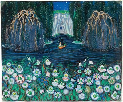 | A fairy tale scene: a dark lake, boat, weeping willos, blossoms | |
