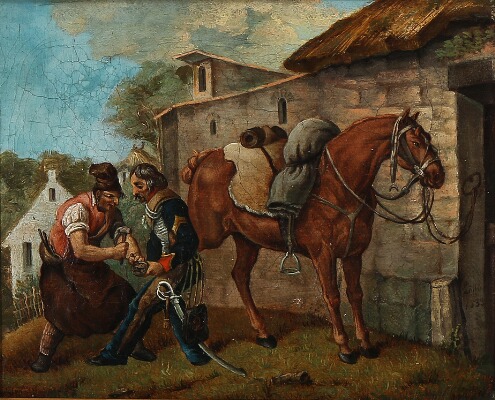 | A soldier getting his horse shoed by the blacksmith. | |
