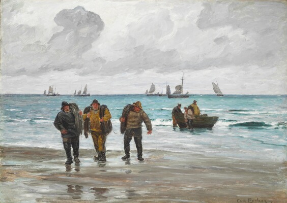 | Coastal scene with fishermen hauling the boat up on shore. Signed Carl Locher | |