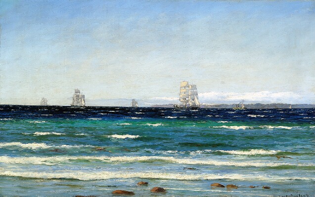 | Hornbæk beach. Numerous ships in the Øresund, in the background Kullen | |