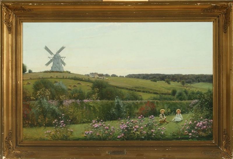 Boy and girl in a garden, in the background a mill.