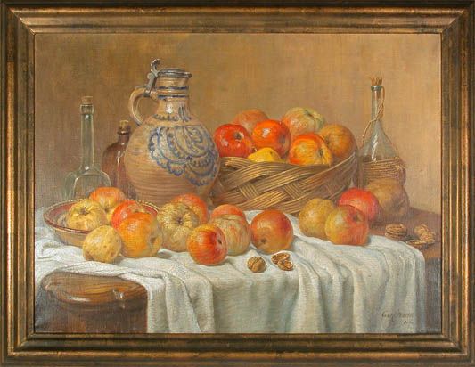 | Auf einer barocken Kommode ein Korb mit Äpfeln, ein Westerwälder Krug, Flaschen und Früchte | |